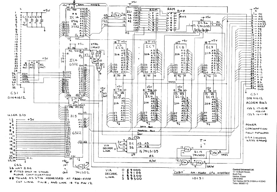 CUBIT is a 6502 based Eurocard not dissimilar to the original Acorn board, it has a 6522 for e.g. keyboard, a 4K EPROM socket and capacity for up to 4K RAM using 2114's. It was originally intended as an expansion board for the AIM65, a wire wrap socket was fitted for the 6502 which then plugged into the empty AIM65 6502 socket.